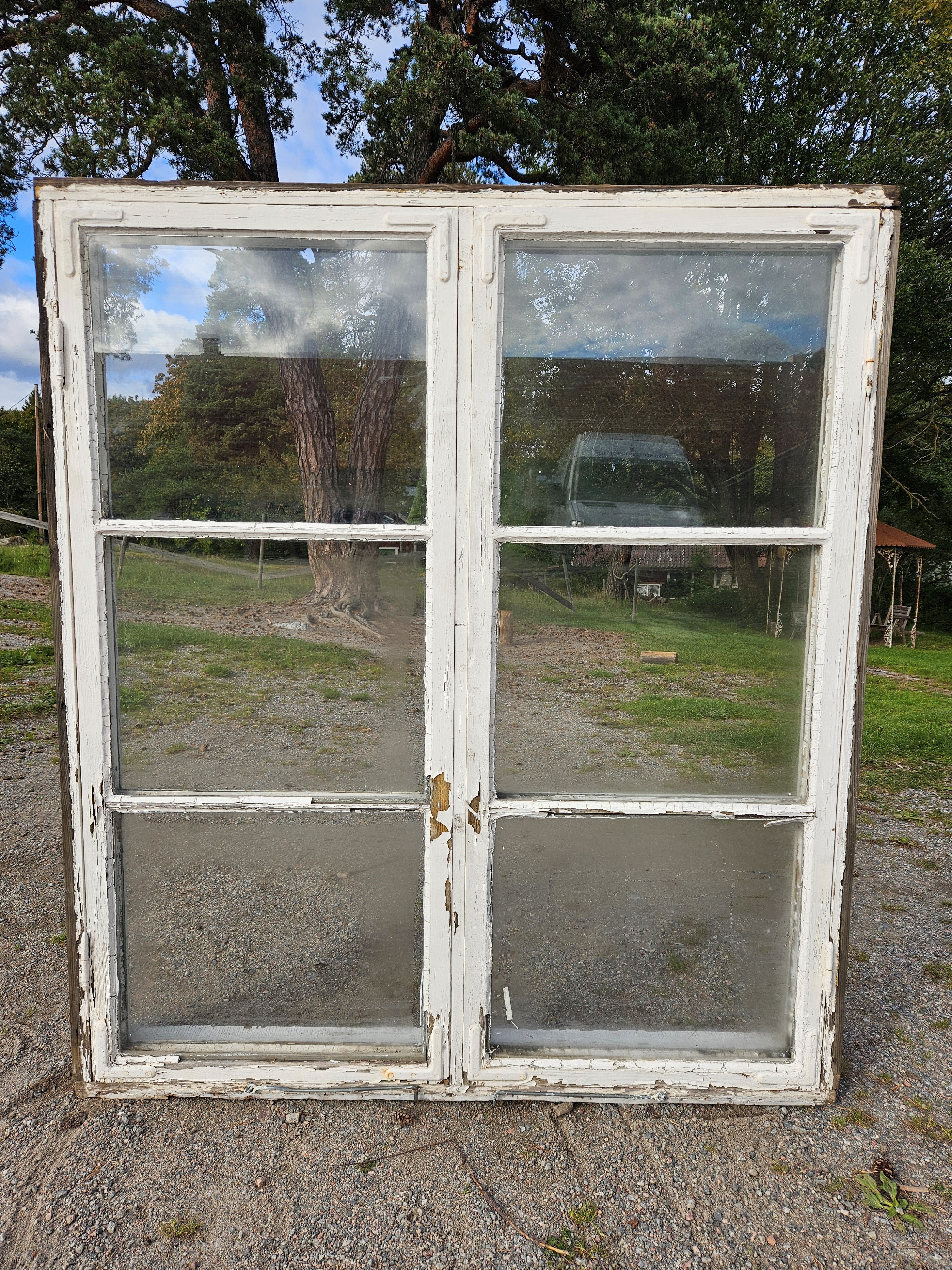 Fönster med karm, kopplade bågar och spröjs på både innre och yttre bågen.